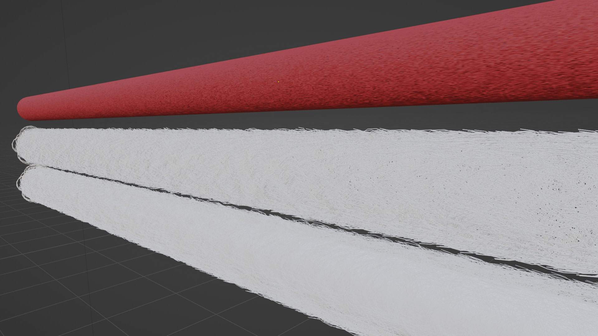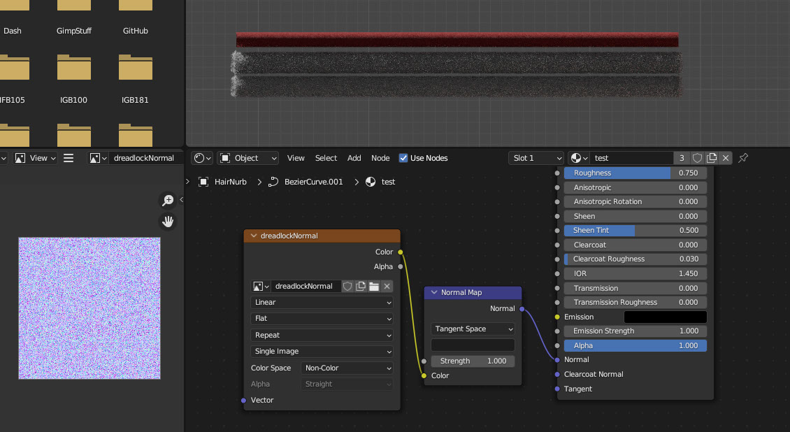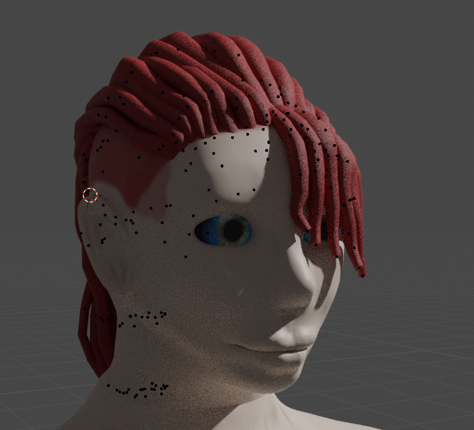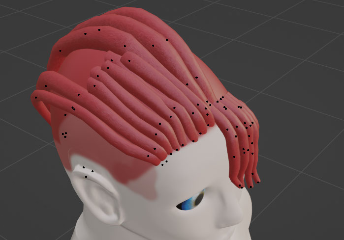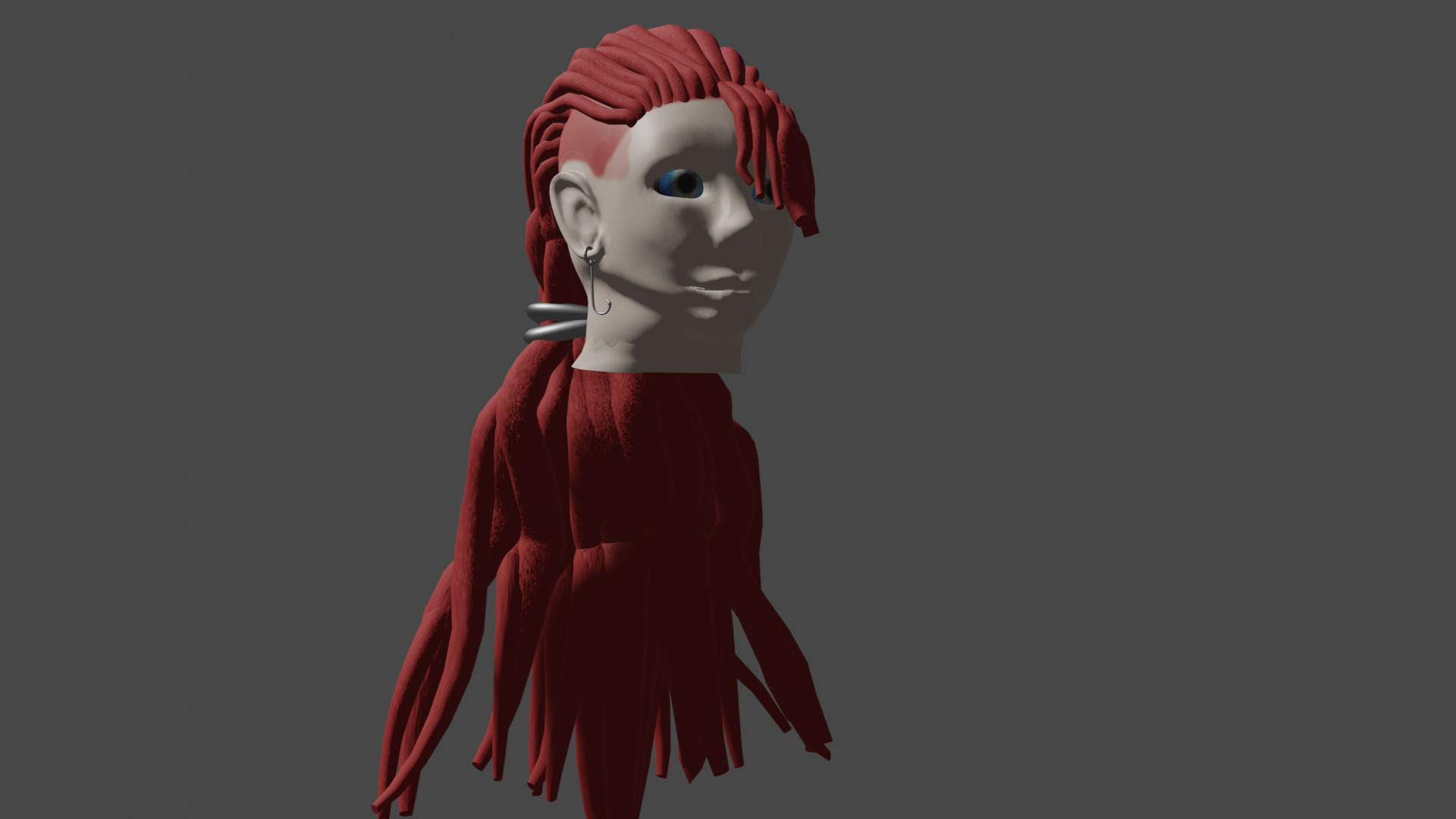 A benefit of using splines like this is that all hair strings share an identical UV. Using an online guide, I managed to simulate the fuzzy look of dreads, however the computing power to make so many strands render was too inefficient. Instead I baked the hair into a bump and applied it to the hair as a shader.