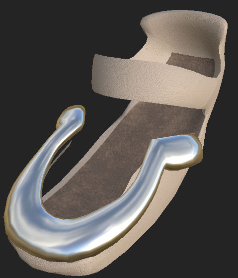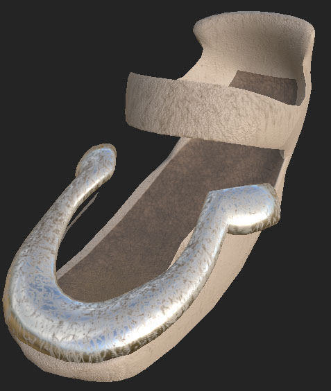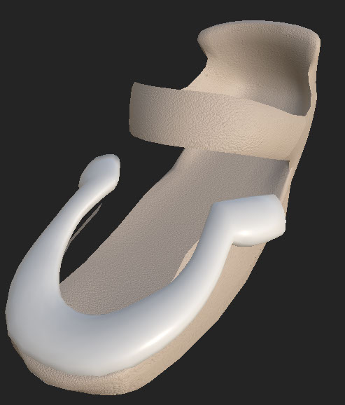 Next I worked on the shoes. Using the shape that I had posed the feet, I simply wrapped them in the shape of a pair of sandals. A U-shape was cut out of the front of the sandal in order to make the horseshoe pop out better. The horseshoe itself was etched out of a design found online, and then warped around the shape of the Kelpie's foot.