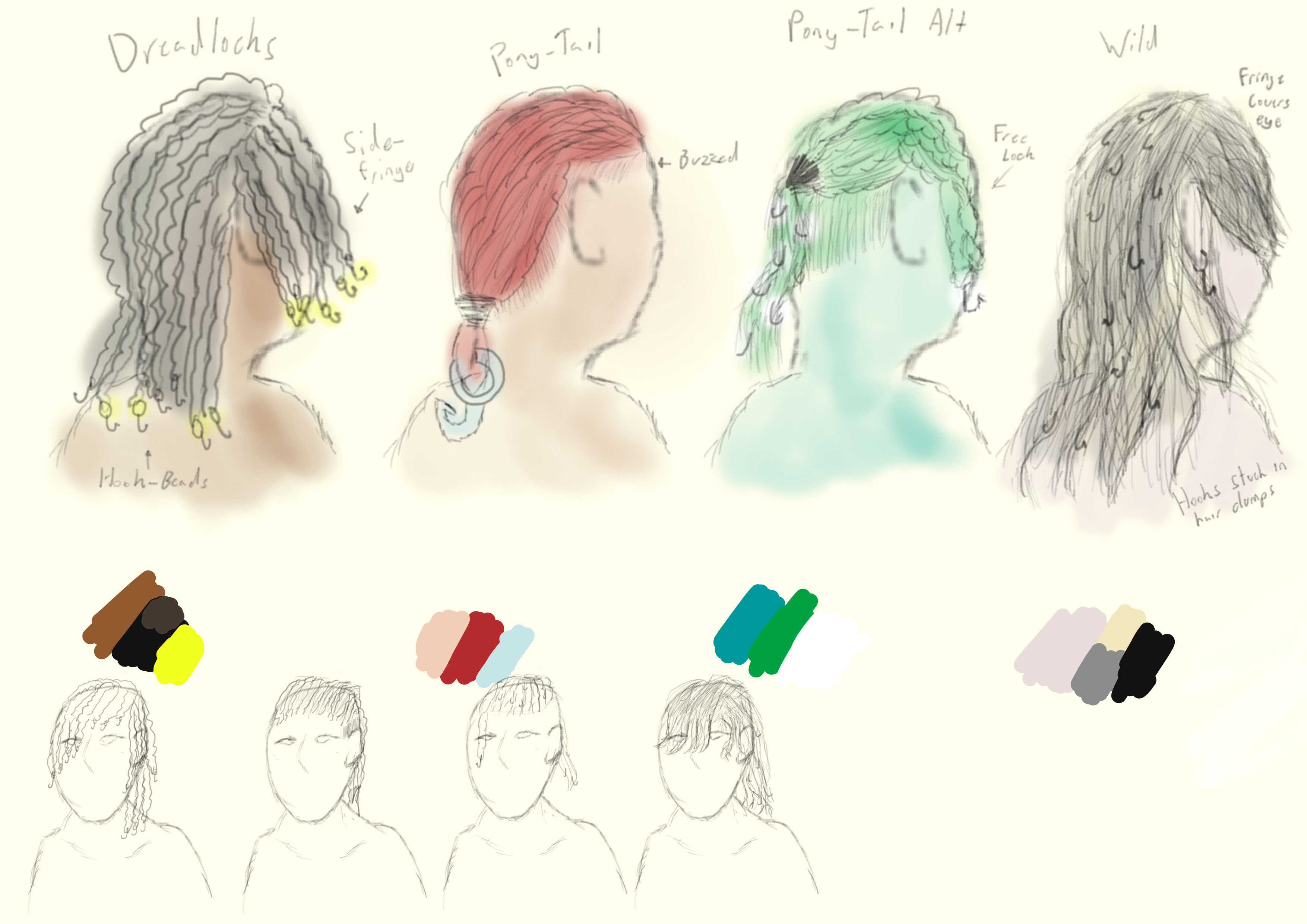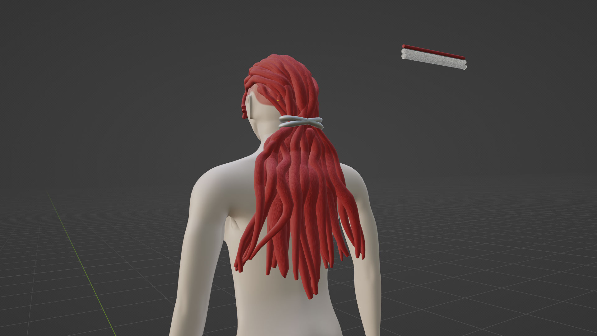 My original idea was to have a short-haired look for the Kelpie, but I changed my mind once I considered her silhouette. I extended the splines further and added a bit of entanglement on the ends to make it look flashier. The middle section was squished together and a hairband was used to hide any odd clipping (plus it looks nice).