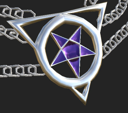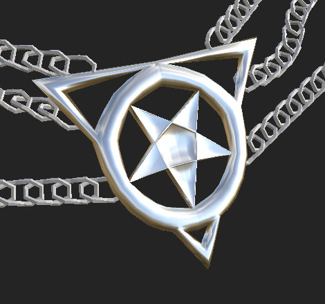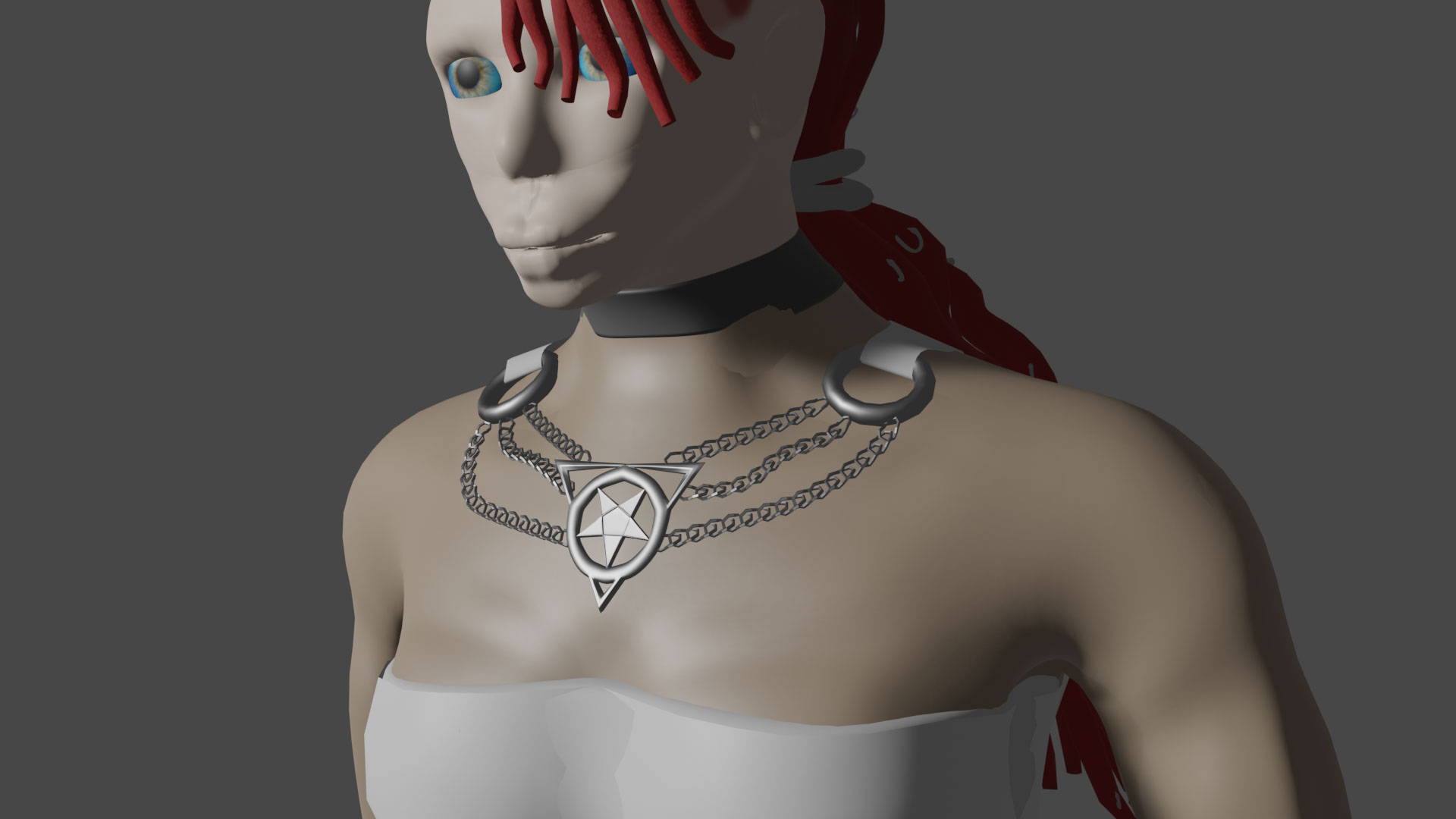 The necklace is the centrepiece of the model, so I wanted it to be as flashy as possible. The pendant is made of a pure silver coat with a glass material being inserted into the pentagram.