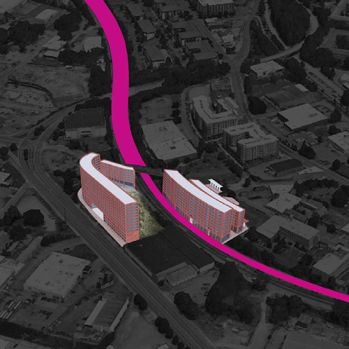 The design is situated above a railway track. The architecture operates as a small-scaled connector between different parts of Atlanta. As people enter into the design, they travel between different portals and can engage with different areas of the city.